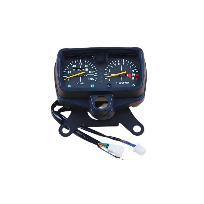 gruppo strumenti della moto CG125, con fori di montaggio e interfacce di cablaggio identiche al supporto anteriore e al sistema elettrico della CG125, compatibile con la Honda CG125,Pearl River 125 e altri modelli di motore a canna superiore da 125 cc, sostituendo direttamente lo strumento originale senza modifiche; integra velocometro (0-120km/h) e tachimetro (0-10×1000r/min), mostrando il chilometraggio e l'indicatore neutro,consentire il monitoraggio in tempo reale dello stato del veicolo durante la guida; utilizza un puntatore meccanico per la visualizzazione precisa dei dati e una forte anti-interferenza, fornendo letture stabili su strade accidentate senza i problemi di salto comuni negli strumenti elettronici;con una lunghezza massima non superiore a 50 mm,, non è necessario tagliare i fili, basta collegare l'interfaccia elettrica del veicolo per un'installazione rapida; la custodia nera con le lancette bianche completa il design anteriore CG125,bilanciare praticità e fascino visivo.
